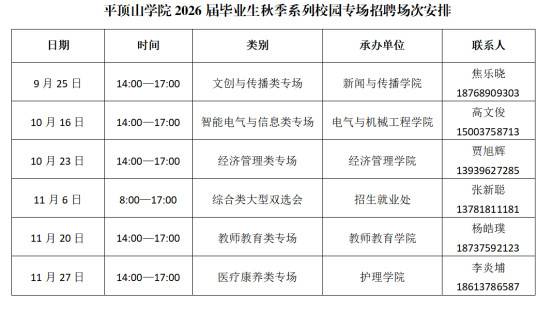自9月起学校将结合学科专业,分类举办文创与传播类、智能电气与信息类、经济管理类、教师教育类、医疗康养类等小型专场及综合类大型双选会,具体招聘场安排请关注“平顶山学院就业信息网”或“平顶山学院就业指导服务中心”微信公众号。
